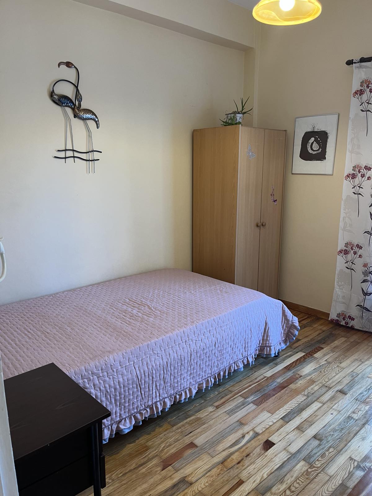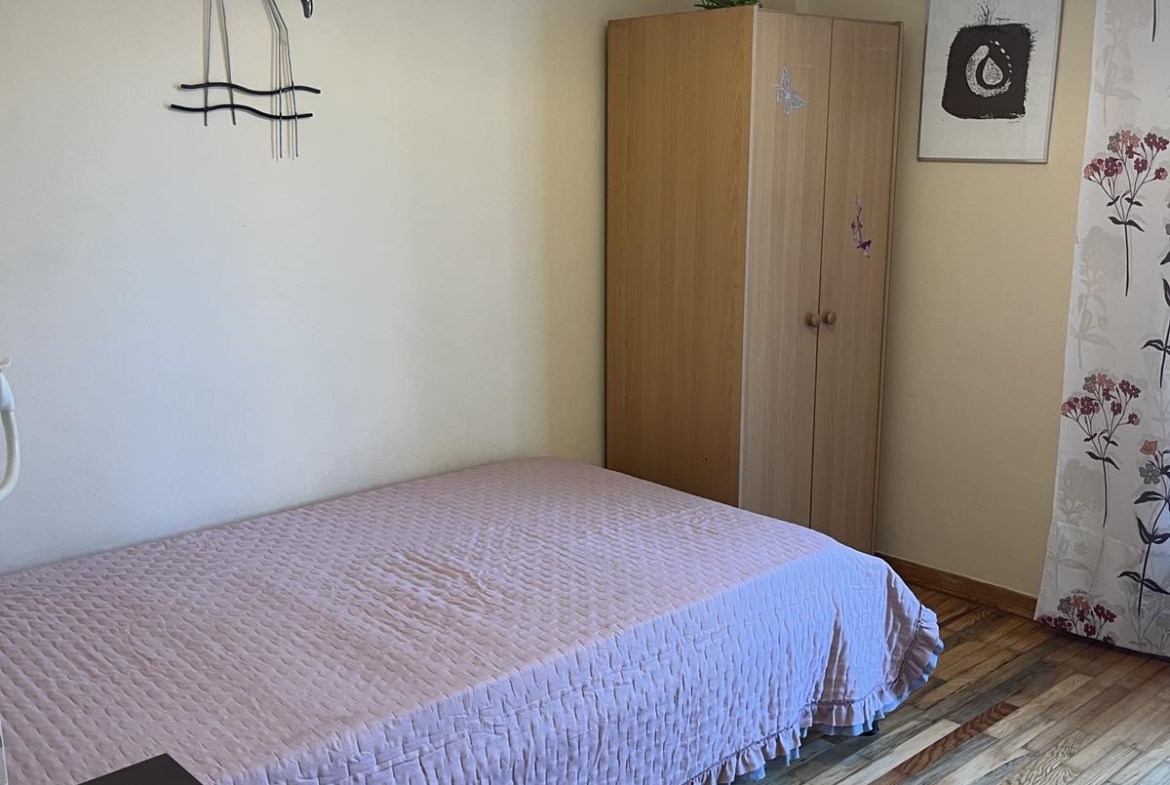 The apartment consists of two bedrooms, one bathroom, a kitchen, and a living/dining area that can be separated if desired. It features two air conditioning units for heating and cooling, aluminum window frames with triple glazing, and a security door.